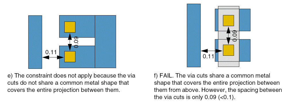 Specifies the minimum spacing between two via cuts with a parallel overlap greater than zero and with neighboring wires at a distance less than within, overlapped by a single metal shape that covers the entire length of the common projection between them from above and/or below.