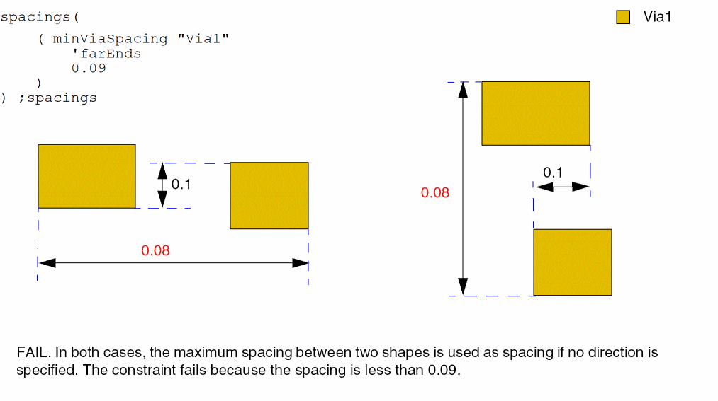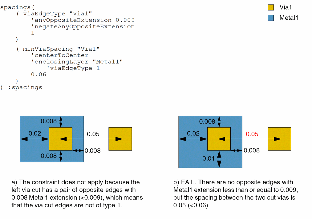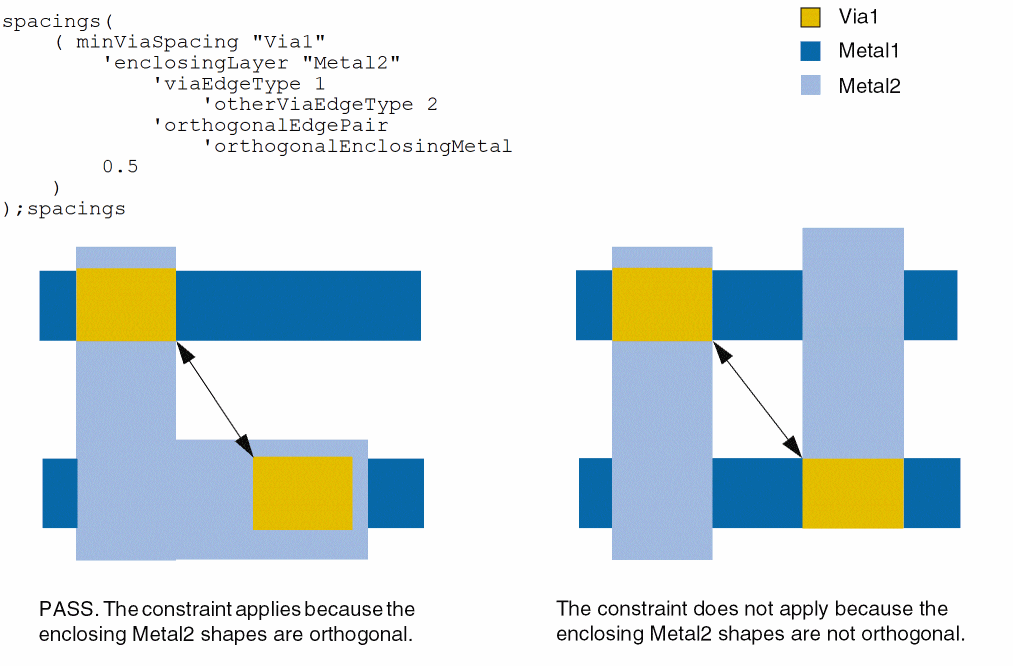 - Example 8: minViaSpacing with orthogonalEdgePair and orthogonalEnclosingMetal