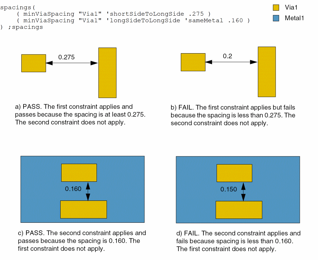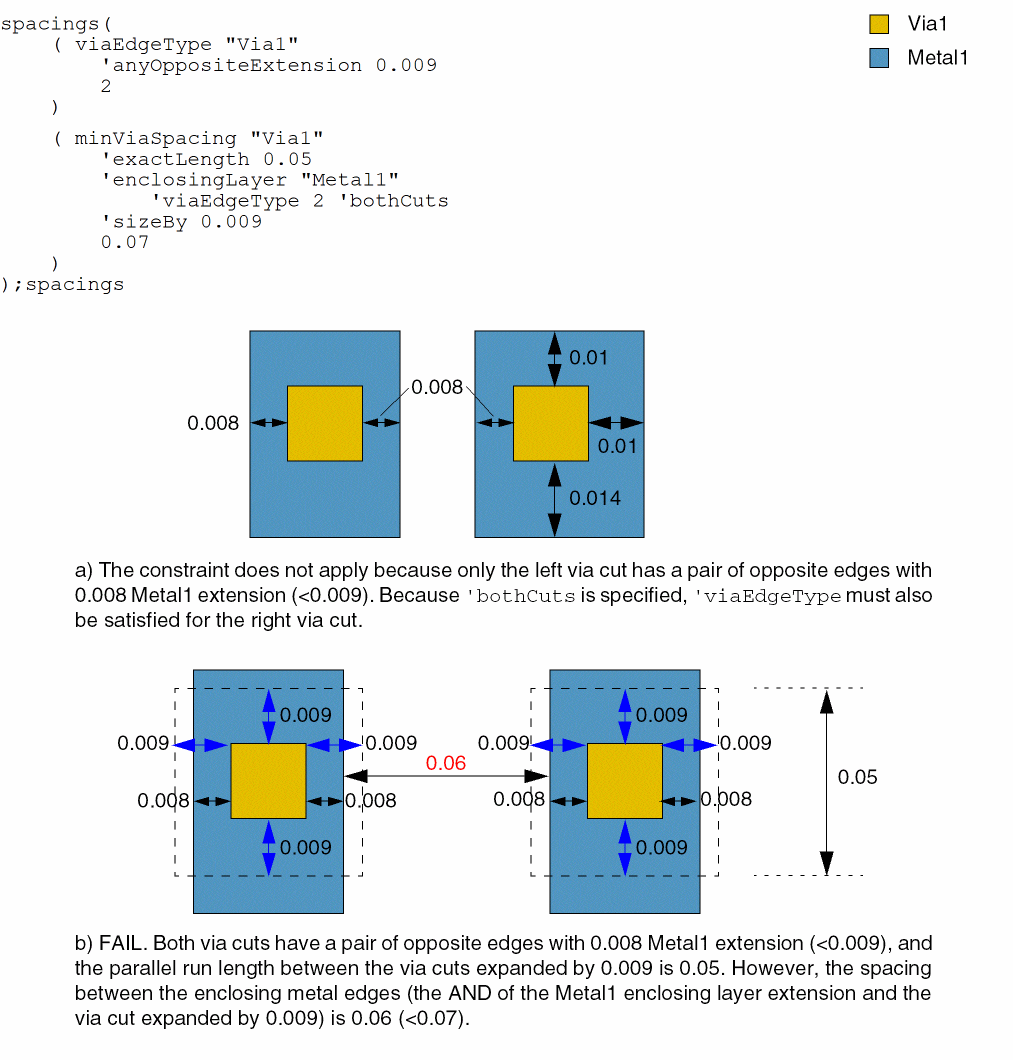 - Example 3: minViaSpacing with exactLength, enclosingLayer, viaEdgeType, bothCuts, and sizeBy