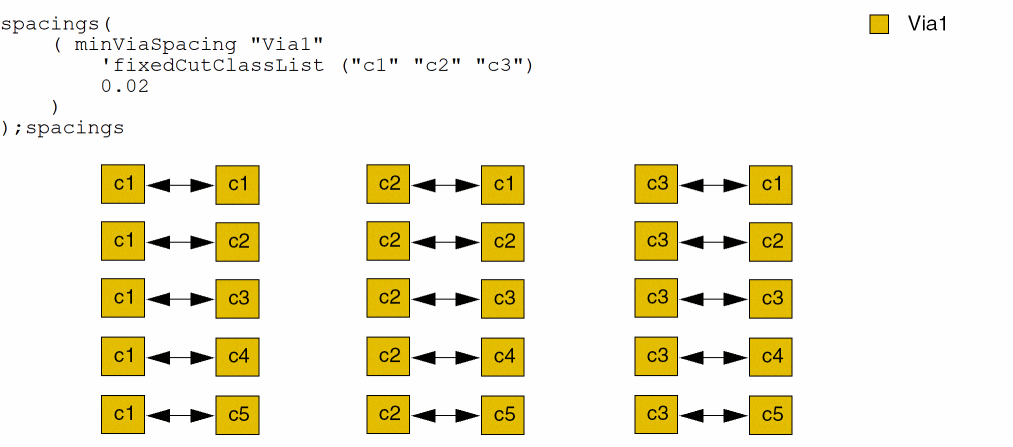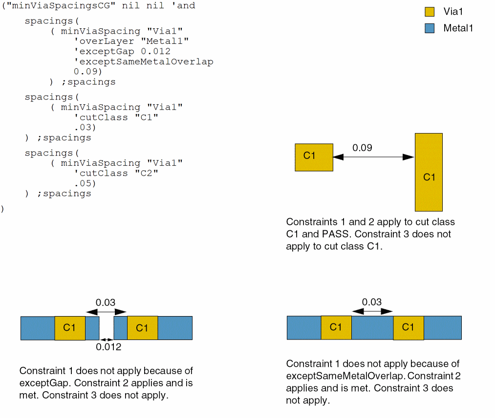 The spacing between two via cuts is checked using the following constraints. Let’s assume that all cuts belong to the C1 cut class.