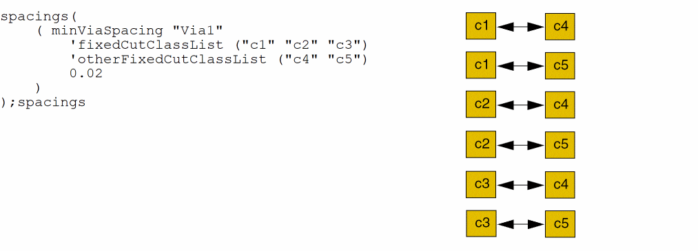 spacingTables( ( minViaSpacingtx_cutLayer(( "width" nil nil ["width" nil nil] ) ['shortSideToShortSide | 'shortSideToLongSide | 'shortSideToAnySide | 'longSideToLongSide | 'longSideToAnySide | 'anySideToAnySide ] ['centerToCenter] ['horizontal | 'vertical] ['sameNet | 'sameMetal | 'sameVia] ['viasOnSameNet | 'viasOnSameMetal | 'viasOnSameVia] ['exceptSameNet | 'exceptSameMetal] ['exceptViasOnSameNet | 'exceptViasOnSameMetal | 'exceptViasOnSameVia] ['sameMask | 'diffMask] ['areaf_area] ['overLayertx_layer['overLayerWidthf_layerWidth] ['exceptGapf_gap] ['exceptSameMetalOverlap] ] ['lengthf_length| 'exactLengthf_exactLength['exactSpacing] 'prlRangef_prlRange] [ ['cutClass {f_width| (f_widthf_length) |t_name} ['otherCutClass {f_width| (f_widthf_length) |t_name}]] | ['fixedCutClassListl_fixedCutClassNames['otherFixedCutClassListl_otherFixedCutClassNames]] ] ['enclosingLayertx_enclosingLayer['viaEdgeTypex_edgeType['bothCuts | 'otherViaEdgeTypex_edgeType2] ['sizeByTouchedCorners (f_sizeBy1f_sizeBy2) ['includedEdgeAligned ['alignedHorizontal|'alignedVertical]]] ['orthogonalEdgePair ['orthogonalEnclosingMetal]] ] ] ['sizeByf_sizeBy] ['exceptExactAligned] ['above | 'below | 'bothAboveBelow] ['exceptRangesl_exceptRanges] ['insideLayers (tx_layer1tx_layer2…tx_layerN) ['insidePurposes (t_purpose1t_purpose2…t_purposeN)] | 'outsideLayers (tx_layer1tx_layer2…tx_layerN) ['outsidePurposes (t_purpose1t_purpose2…t_purposeN)] ] [ 'ignoreRegion ] | [ 'abutRegion ] ['facingEdges] ['deltaVoltagef_voltage] ['horizontalSpacingRangef_spacingRange] ['verticalSpacingRangef_spacingRange] ['farEnds] [f_default] ) (g_table) ['manhattan] )