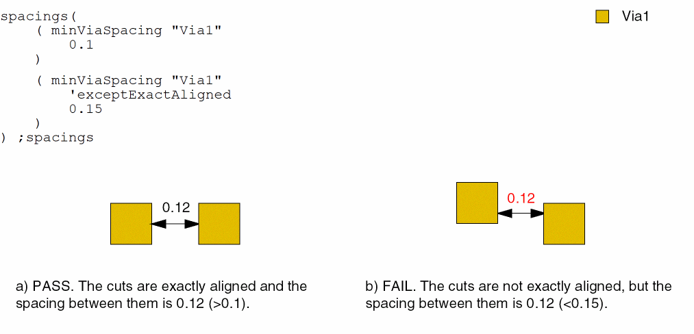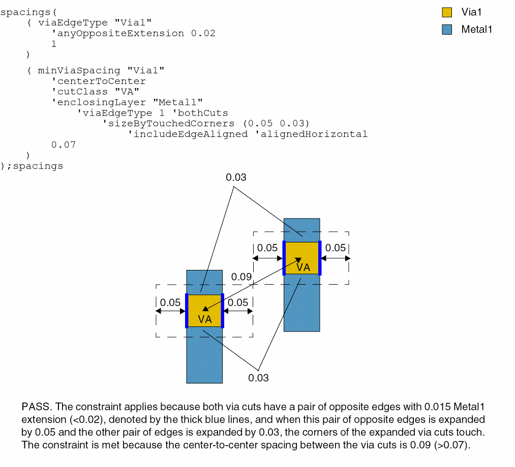 - Example 6: minViaSpacing with centerToCenter, cutClass, enclosingLayer, and sizeByTouchedCorners