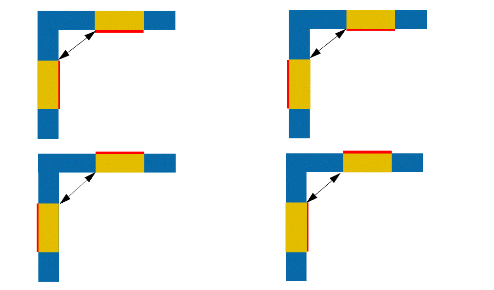 The following diagram illustrates cases of orthogonal pairs where the constraint applies. All the distances must be greater than f_spacing. The arrows indicate the distance between the cut shapes having orthogonal pairs of edges.