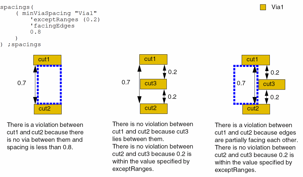 spacings( ( minViaSpacingtx_cutLayer['shortSideToShortSide | 'shortSideToLongSide | 'shortSideToAnySide | 'longSideToLongSide | 'longSideToAnySide | 'anySideToAnySide ] ['centerToCenter] ['horizontal | 'vertical] ['sameNet | 'sameMetal | 'sameVia] ['viasOnSameNet | 'viasOnSameMetal | 'viasOnSameVia] ['exceptSameNet | 'exceptSameMetal] ['exceptViasOnSameNet | 'exceptViasOnSameMetal | 'exceptViasOnSameVia] ['sameMask | 'diffMask] ['areaf_area] ['overLayertx_layer['overLayerWidthf_layerWidth] ['exceptGapf_gap] ['exceptSameMetalOverlap] ] ['lengthf_length| 'exactLengthf_length['exactSpacing] | 'prlRangef_prlRange] [ ['cutClass {f_width| (f_widthf_length) |t_name} ['otherCutClass {f_width| (f_widthf_length) |t_name}]] | ['fixedCutClassListl_fixedCutClassNames['otherFixedCutClassListl_otherFixedCutClassNames]] ] ['enclosingLayertx_enclosingLayer['viaEdgeTypex_edgeType['bothCuts | 'otherViaEdgeTypex_edgeType2] ['sizeByTouchedCorners (f_sizeBy1f_sizeBy2) ['includedEdgeAligned ['alignedHorizontal|'alignedVertical]]] ['orthogonalEdgePair ['orthogonalEnclosingMetal]] ] ] ['sizeByf_sizeBy] ['exceptExactAligned] ['exceptRangesl_exceptRanges] ['insideLayers (tx_layer1tx_layer2…tx_layerN) ['insidePurposes (t_purpose1t_purpose2…t_purposeN)] | 'outsideLayers (tx_layer1tx_layer2…tx_layerN) ['outsidePurposes (t_purpose1t_purpose2…t_purposeN)] ] [ 'ignoreRegion ] | [ 'abutRegion ] ['facingEdges] ['deltaVoltagef_voltage] ['horizontalSpacingRangef_spacingRange] ['verticalSpacingRangef_spacingRange] ['farEnds]f_spacing['manhattan] )