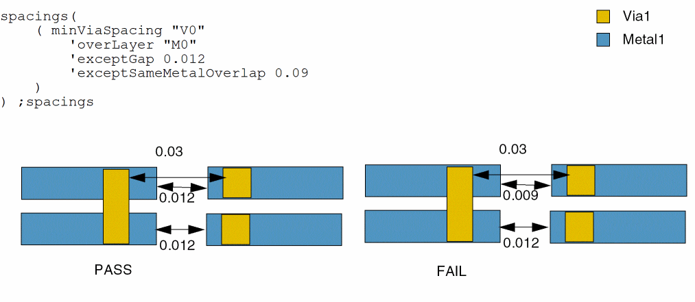 - Example 11: minViaSpacing with exceptGap and exceptSameMetalOverlap