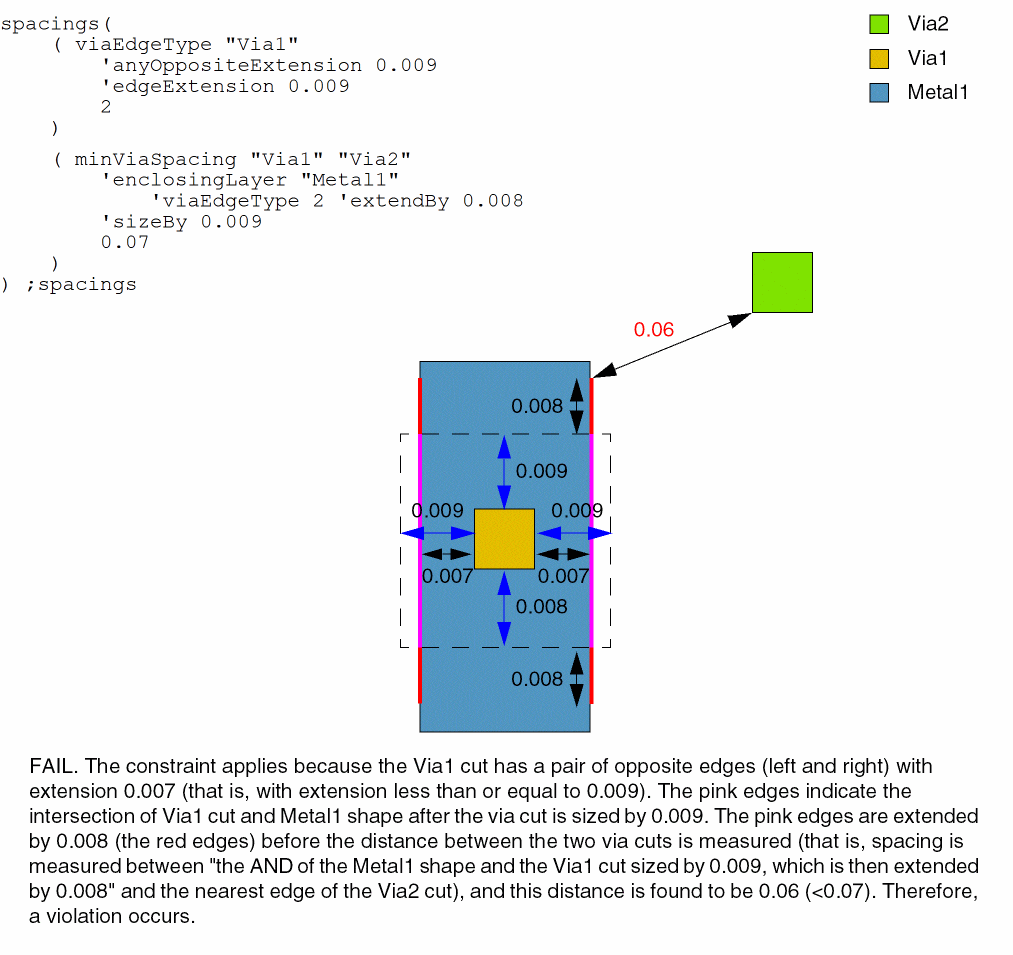 - Example 2: minViaSpacing with edgeType, enclosingLayer, sizeBy, and extendBy