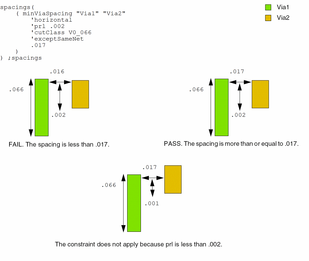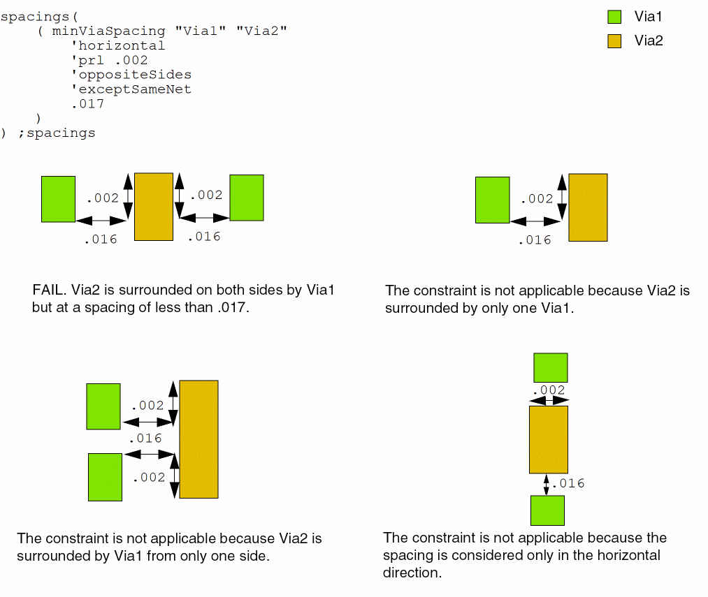 The constraint applies only if the spacing between the vias is more than or equal to .017, prl is greater than or equal to .002, and the Via1 shape is surrounded by the Via2 shape on opposite sides.