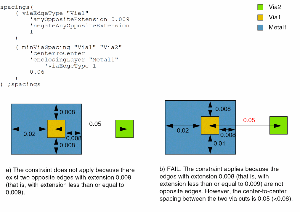 - Example 1: minViaSpacing with centerToCenter, enclosingLayer, and viaEdgeType