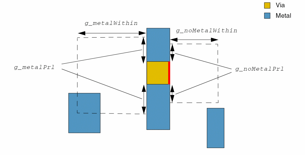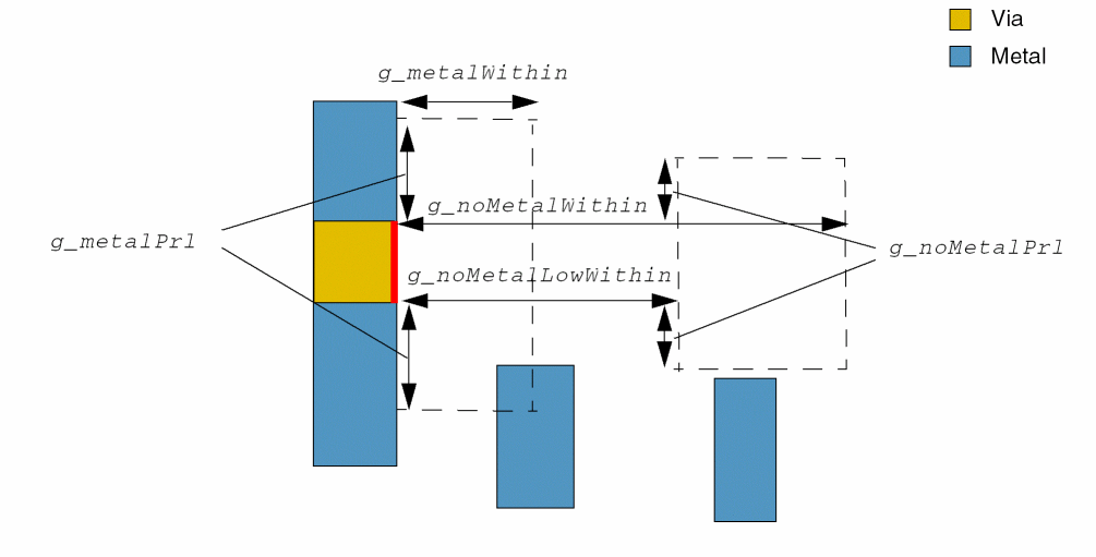 A cut edge fulfilling metalWithin and noMetalWithin conditions to any cut should be more than or equal to g_exceptSpacing. Search windows are formed on the opposite cut edges in the preferred direction on the above or below metal layers by using g_metalPrl and g_metalWithin on one of the cut edges and g_noMetalPrl and g_noMetalWithin on the opposite cut edge. The first metal search window overlaps a metal neighbor whereas the second metal search window does not overlap a metal neighbor. The cut edge without a metal neighbor is subject to this spacing rule.