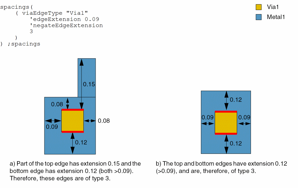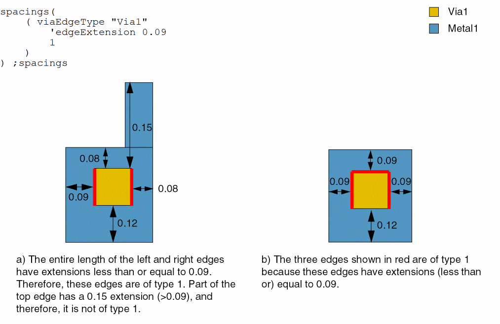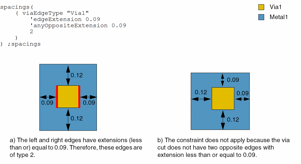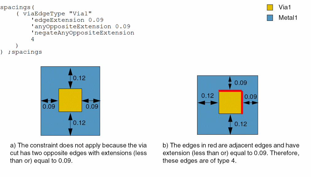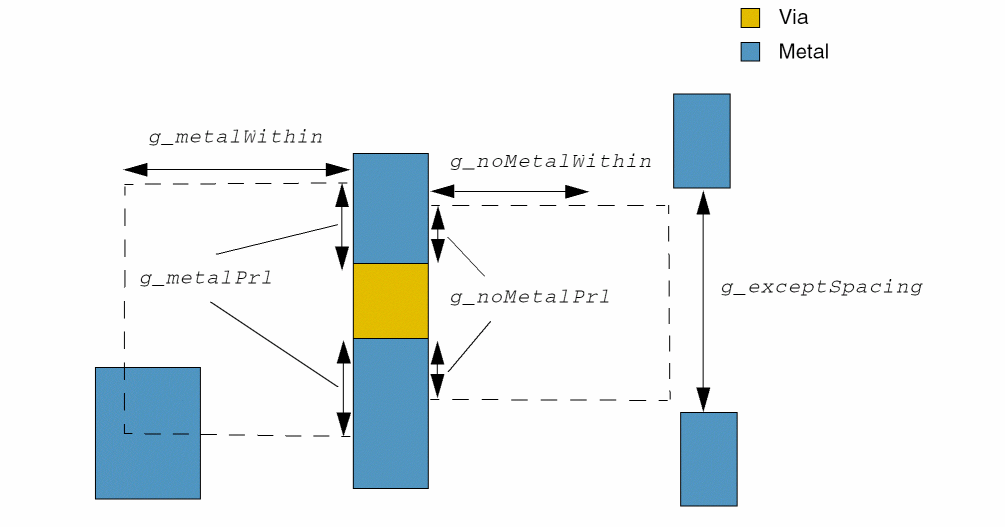 - Example 5: viaEdgeType with metalWithin, noMetalWithin, horizontalEdge, and exceptSpacing