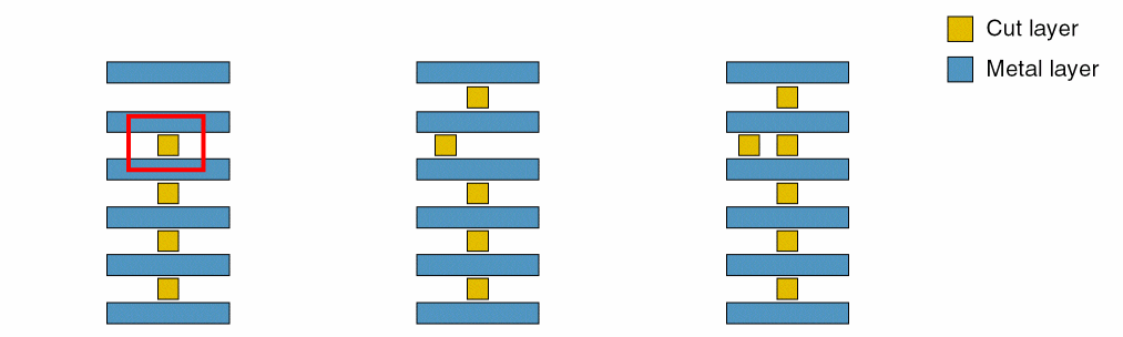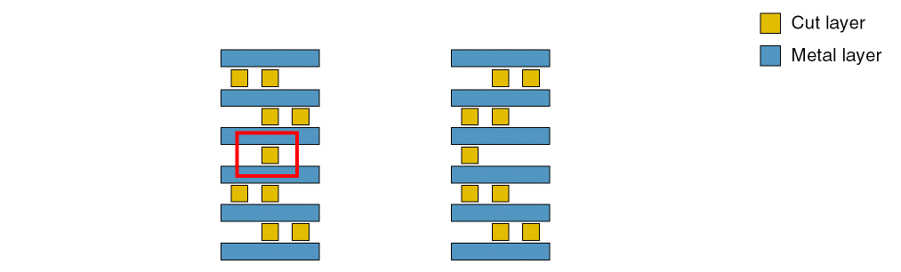 In the second example below, if the via stacking limit is set to 3 and 'noSingleCut is specified, the figure on the left violates the constraint because a single-cut via is not allowed in a stack that is taller than 3.