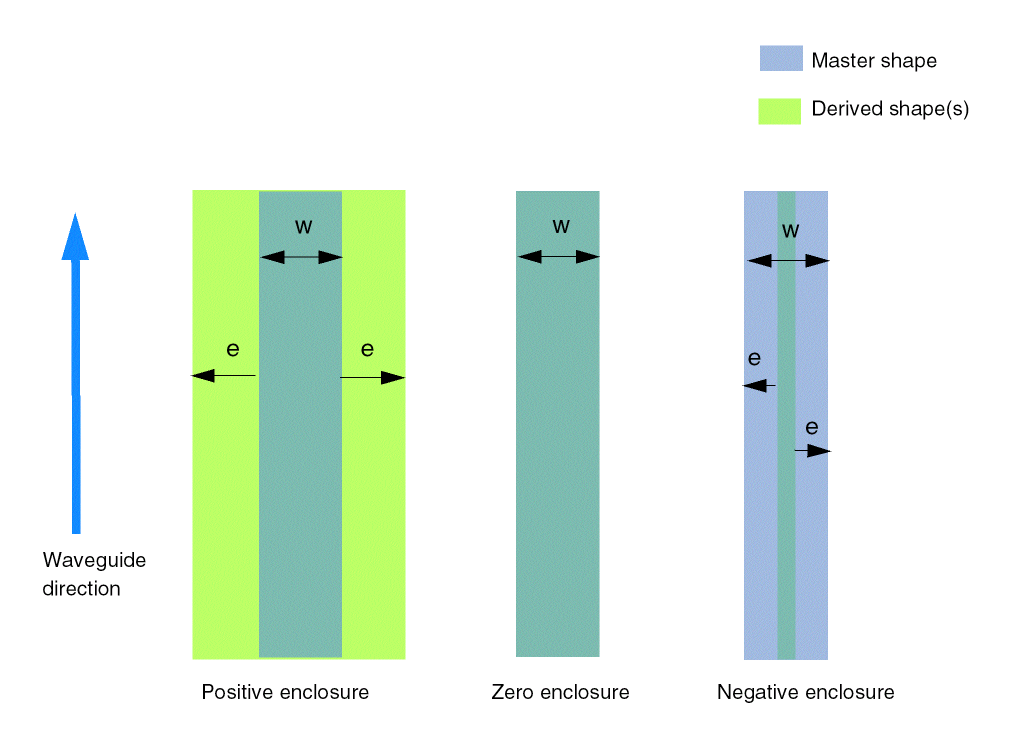 The following figure illustrates the direction in which the enclosure for enclosure shapes is applied. A positive number extends the enclosure outside the master shape. A zero enclosure results in a derived shape with the same dimensions as the master shape. A negative number makes the derived shape skinnier than the master shape.
