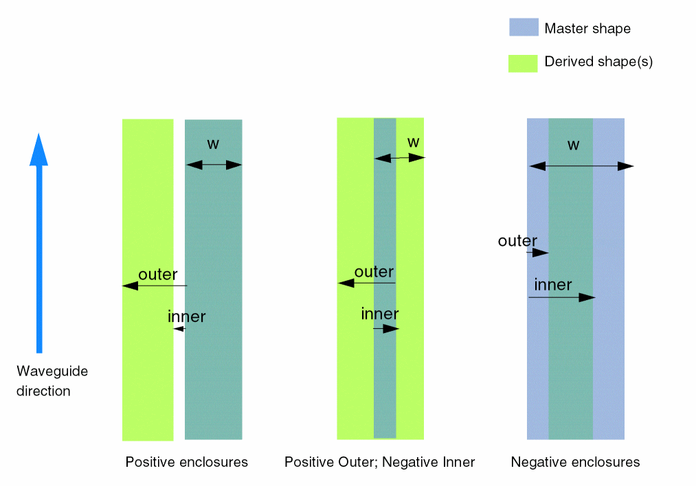 The following figures illustrates the direction in which the enclosure for offset shapes is applied. A positive number extends away from the edge of the master shape. A negative number is directed from the edge of the master shape into the master shape.