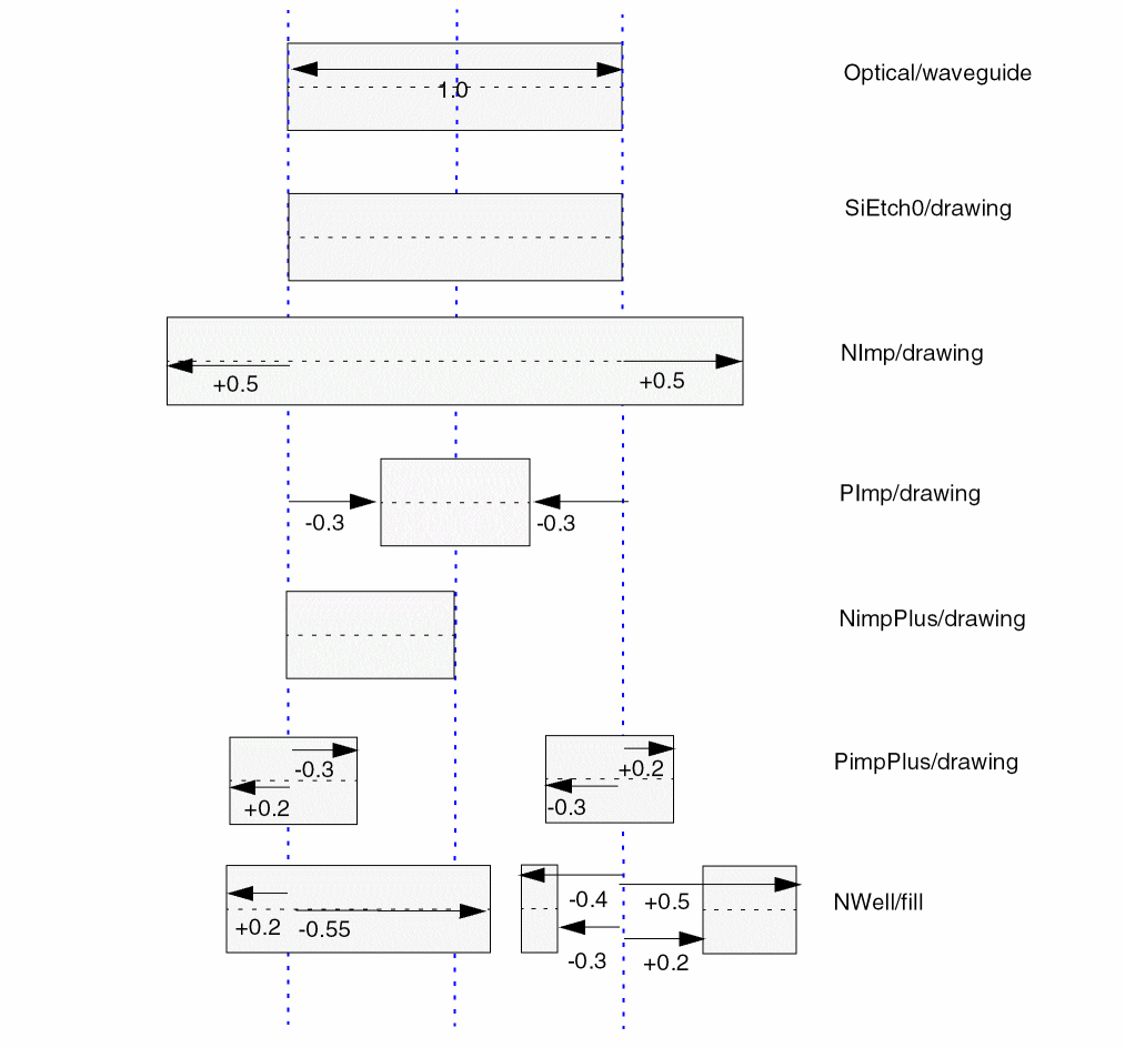 (("SiEtch0""drawing") 'type"enclosure"'enclosure 0.8) (("NImp""drawing") 'type"enclosure"'enclosure"0.5*w") (("PImp""drawing") 'type"enclosure"'enclosure -0.3 ) (("NimpPlus""drawing") 'type"offset"'side"left") (("PimpPlus""drawing") 'type"offset"'inner -0.3 'outer 0.2) (("NWell""fill") 'type"offset"'side"right"'inner"-0.4*w"'outer"-0.4*w + 0.1") (("NWell""fill") 'type"offset"'side"left"'inner -0.55 'outer 0.2) (("NWell""fill") 'type"offset"'side"right"'inner 0.2 'outer 0.5) ) ;simpleWaveguide