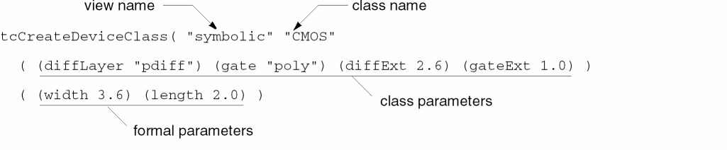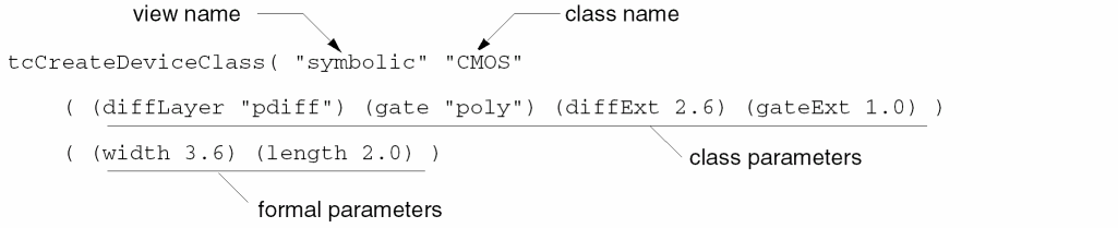 The first line in the following example names the class CMOS and assigns it the view name symbolic (that is, all devices in this class are saved as symbolic cellviews). The closing parenthesis for the tcCreateDeviceClass statement appears at the end of the entire device class definition.