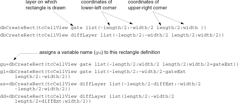 In this example, tcCellView is a previously defined global variable that assigns the view name, symbolic. The global variable is defined only while the SKILL code is being run. The remaining four lines define the diffusion and gate extensions, assigning variable names (gu, gl, ss, and dd) to some of the rectangles for use later in this device class definition.
