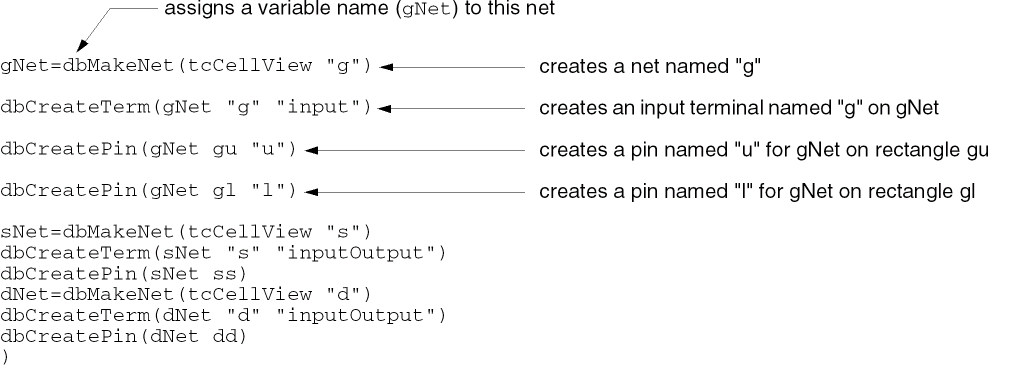 The final section of the SKILL code defines the nets, terminals, and pins required by this device. The first line in the following example defines a new net named g and assigns that net the variable name gNet. The next three lines define one terminal and two pins on this net.