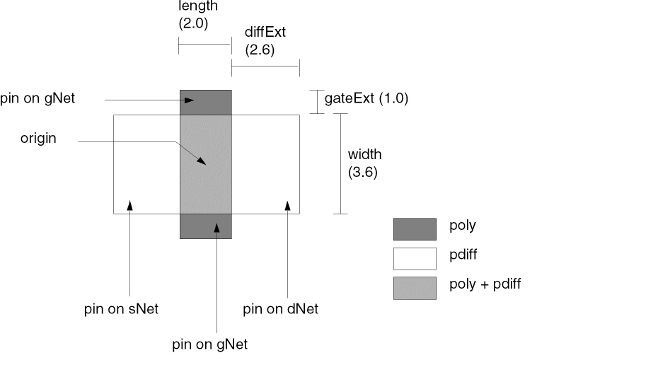 The second line in the figure above lists the class parameters. You can create any parameter name you want and assign it a default value. In this example, the class parameters diffLayer and gate assign the layers on which the device is constructed. The diffExt and gateExt parameters define the amount of extension on the diffusion and gate layers, in microns.