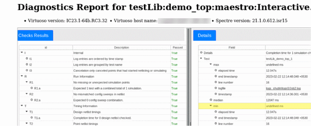 An HTML report with the titleLog Diagnostics Reportis generated. The subtitle of this report is in the format LibName:CellName:ViewName (historyName). Here, historyName represents the history being used. LibName, CellName, and ViewName represent the names of the library, cell, and view for the test associated to that history. The report also lists the Virtuoso and Spectre versions being used along with the Virtuoso host name.
