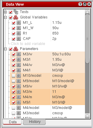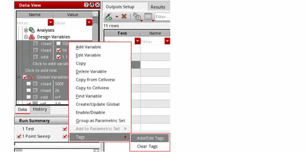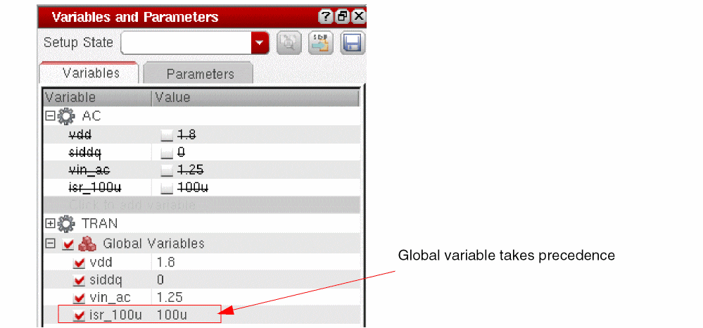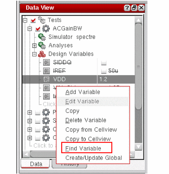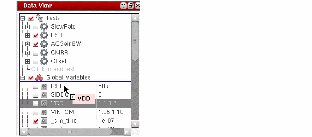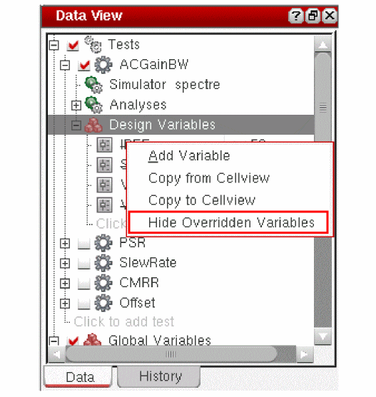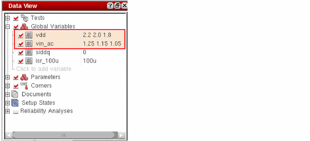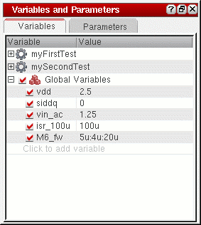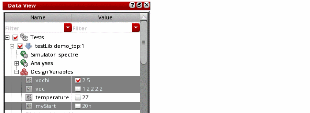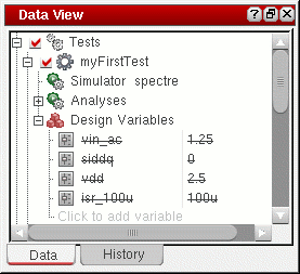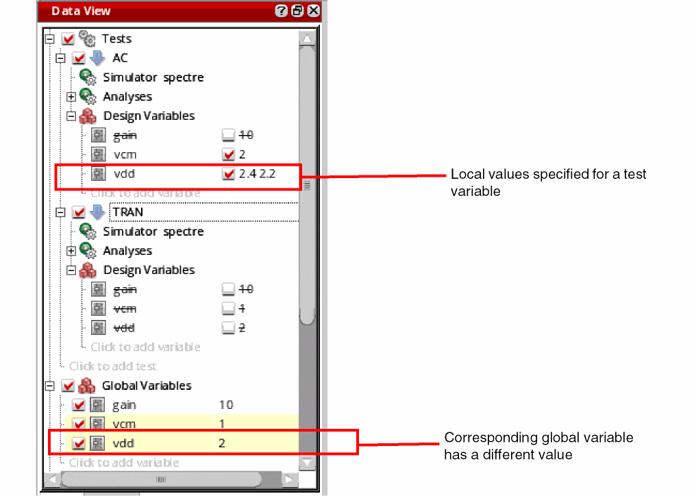 Your design variable and its value appears in the expanded test tree on the Data View pane and on the Variables tab of the Variables and Parameters pane.You can also define variables in a definitions file.By default, the design variables defined for your tests are not automatically promoted as global variables in the Global Variables tree on the Data View assistant pane and the Variables tab of the Variables and Parameters assistant pane. You can set the autoPromoteVarsToGlobal environment variable inmaestro.cdsenvtotto automatically promote new design variables as global variables. The design variables are displayed with a strikethrough because the settings for a global variable override the settings of design variables that have the same name as the global variable. For example, in the following figure, the design variables specified for the test namedmyFirstTestare automatically added as global variables. The design variables are displayed with a strikethrough because the global variables override the design variables.