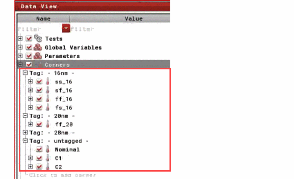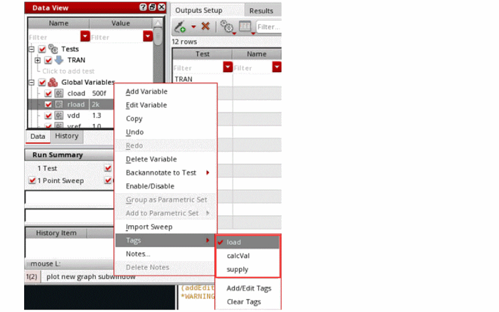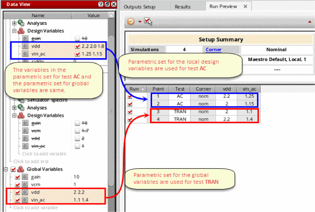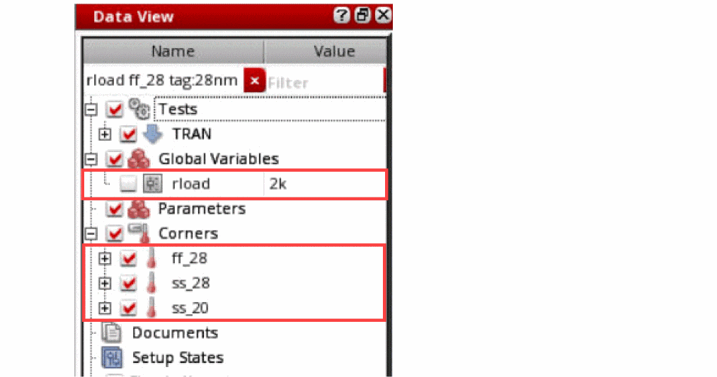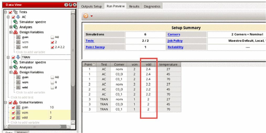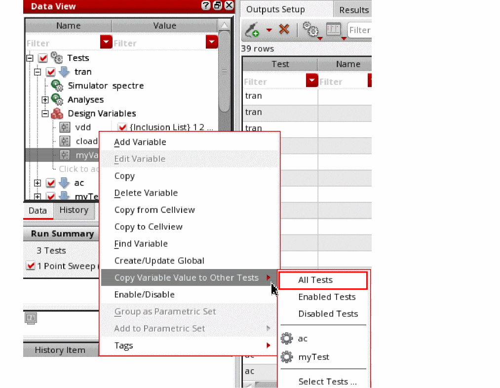 Your design variable and its value appears in the expanded test tree on the Data View pane and on the Variables tab of the Variables and Parameters pane.You can also define variables in a definitions file.By default, the design variables defined for your tests are not automatically promoted as global variables in the Global Variables tree on the Data View assistant pane and the Variables tab of the Variables and Parameters assistant pane. You can set the autoPromoteVarsToGlobal environment variable inmaestro.cdsenvtotto automatically promote new design variables as global variables. The design variables are displayed with a strikethrough because the settings for a global variable override the settings of design variables that have the same name as the global variable. For example, in the following figure, the design variables specified for the test namedmyFirstTestare automatically added as global variables. The design variables are displayed with a strikethrough because the global variables override the design variables.