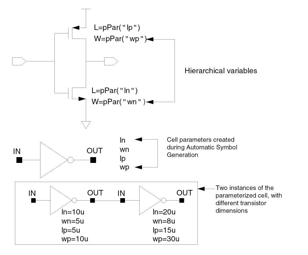 When you create new symbols using automatic symbol generation (the Create Cellview – From Cellview command in the Schematic window), the system creates component parameters for the parameters you defined with pPar. The following illustration gives an example of the automatic symbol generation process.