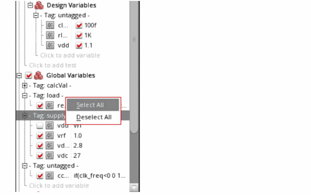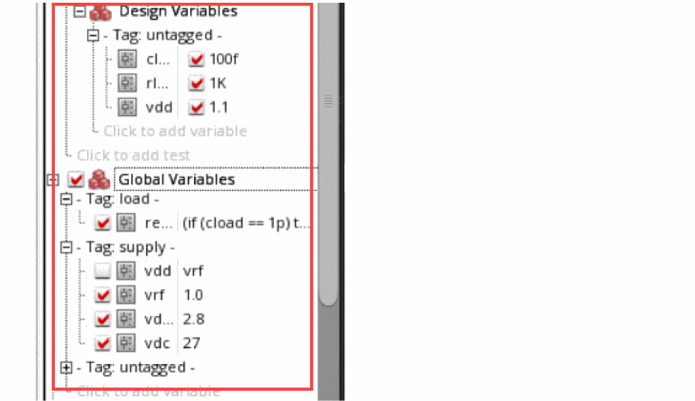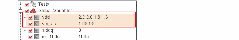If the autoPromoteVarsToGlobal environment variable is set to nil, a design variable for a test is automatically promoted as global variables and the variable appears with a strikethrough in the list of variables for that test.