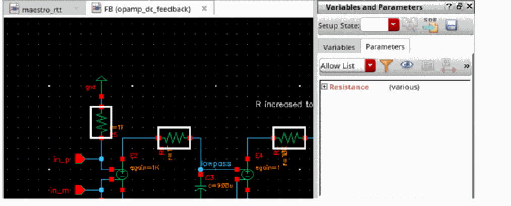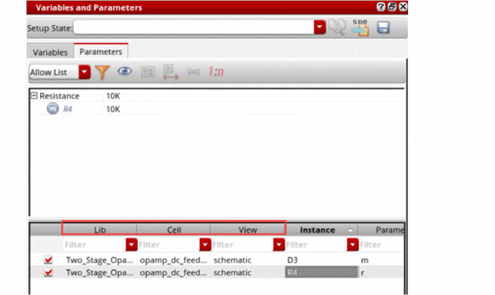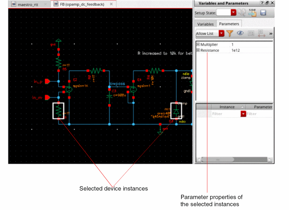 You can use design variables and Component Description Format (CDF) instance parameters to set component values for simulation. Design variable values apply to specific tests. The scope of a CDF parameter value depends on which