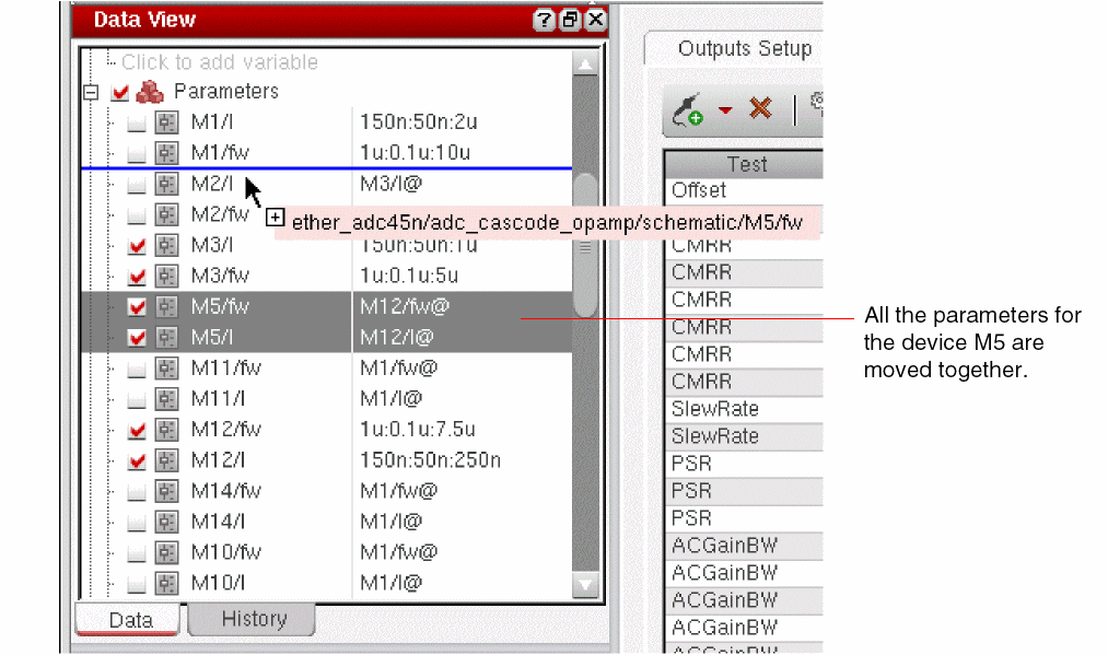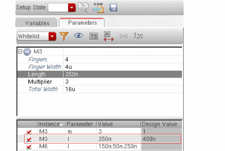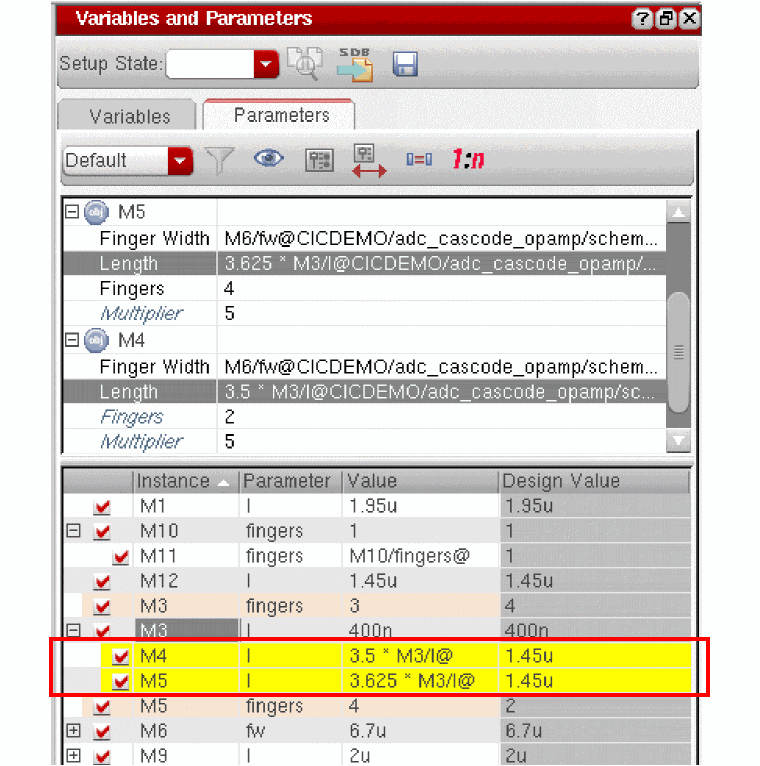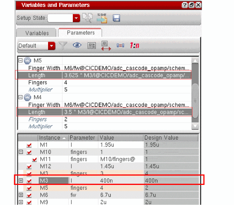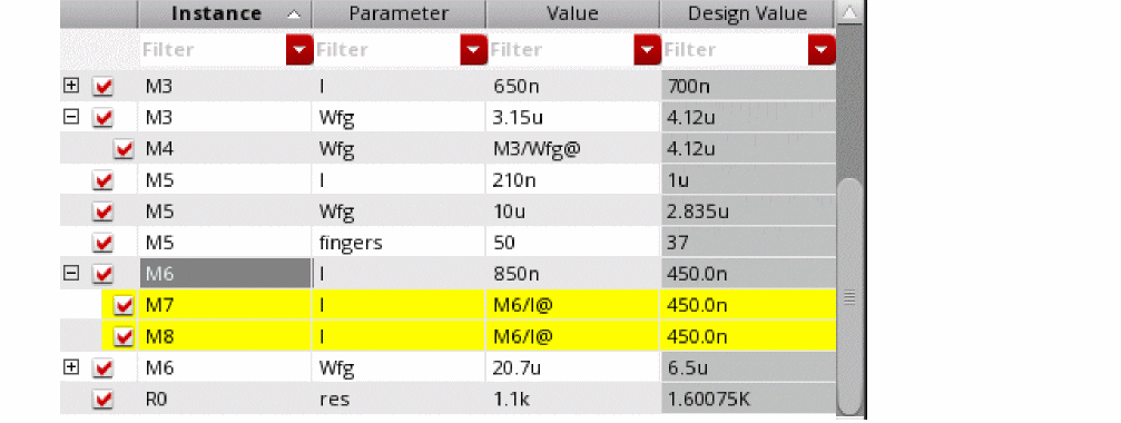 For example, if you selected three devices,M3,M4, andM5, and created a ratio-matched parameter for the parameter length, a new row displayingM3andlis created, as shown below.