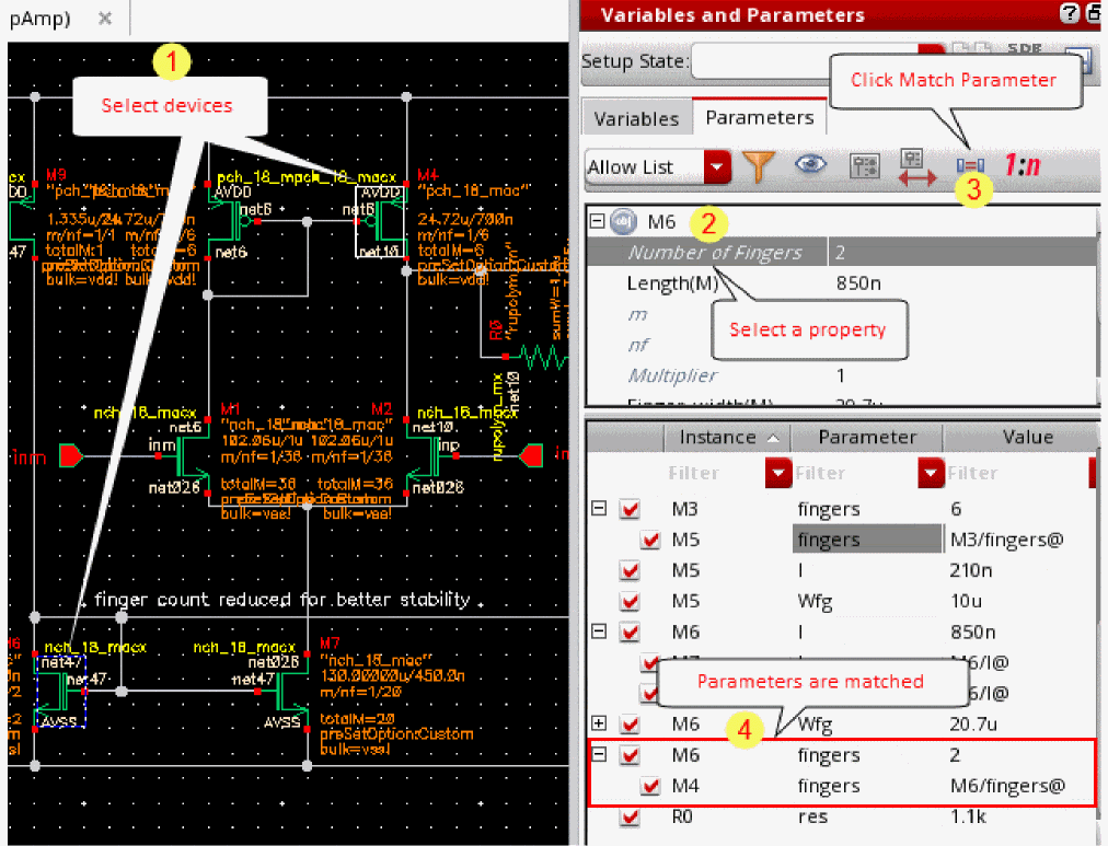For example, in the above figure, the valueprimaryInstName/deviceParam@M6/l@for instanceM7indicates that thelengthparameter of instanceM7is matched to thelparameter of instanceM6(the primary device).