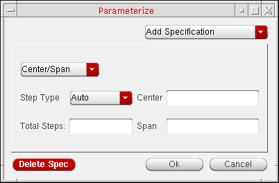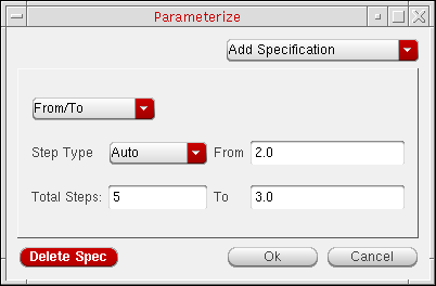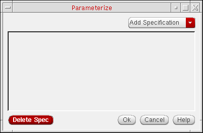 - On the Parameterize form, right-click in the row or section for the parameter specification you want to delete and choose Delete Specification from the context-sensitive menu. (Delete Specification is the only item on this context-sensitive menu.)
