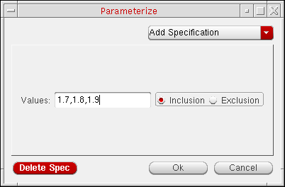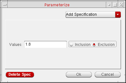 A row appears on the Parameterize form for defining the specification type you selected. The Exclusion radio button is on.