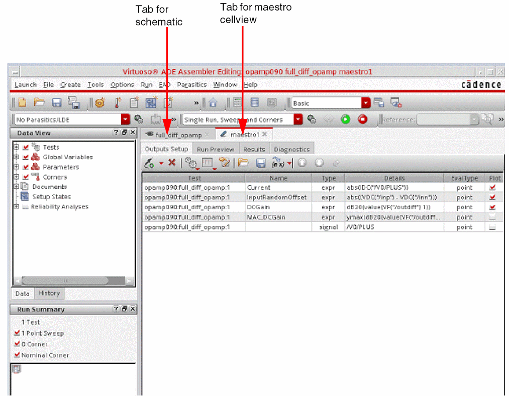 The tab for the schematic design displays the name of the cell for the schematic design. The tab for the ADE Assembler environment displays the name of the maestro cellview. For more information about working with tabs, see the Virtuoso Design Environment User Guide.