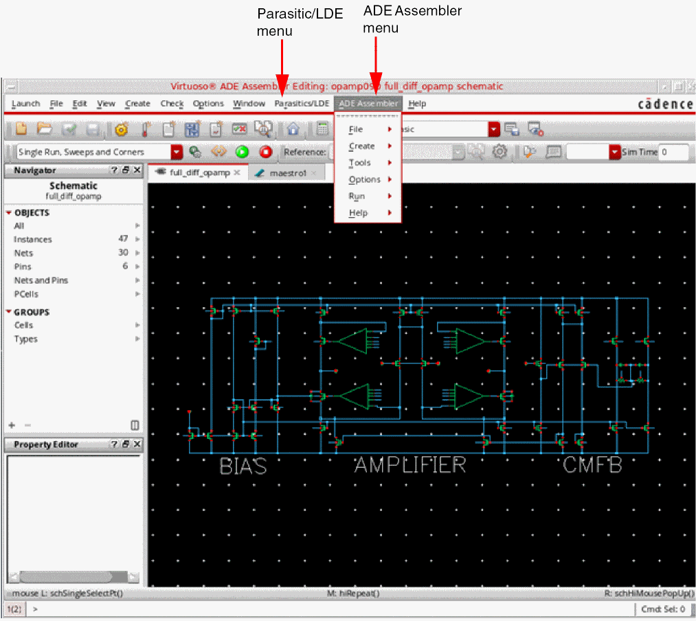 The ADE Assembler environment appears.The cellviews saved from both ADE Explorer or ADE Assembler are of type maestro, and can be opened in either one of these applications. Virtuoso remembers the application that was last used to save each maestro cellview and by default, opens the view in the same application next time. However, you can still open a maestro cellview in a specific application by using theOpen withcommand.