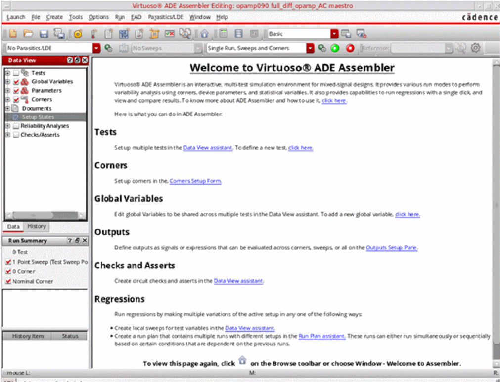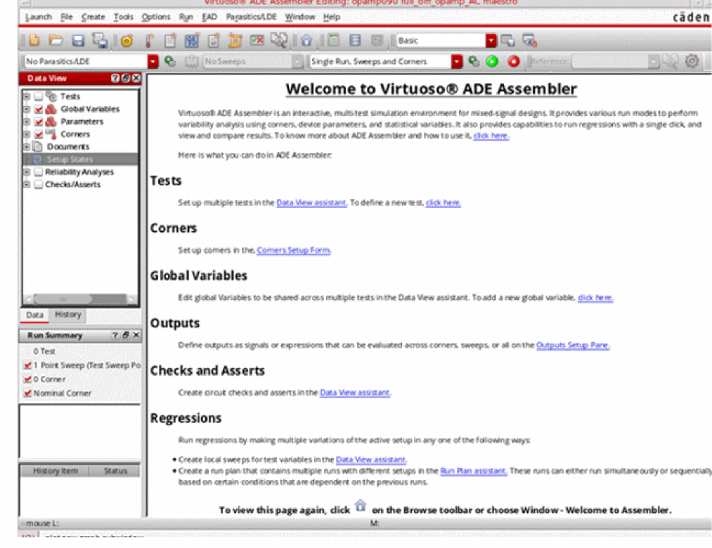 If you open a new cellview in ADE Assembler. the Welcome to Virtuoso ADE Assembler start page is displayed. For more information about the Welcome to ADE Assembler start page, see The Welcome to ADE Assembler Page.