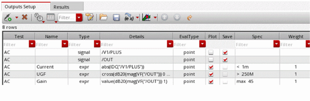 The Outputs Setup tab of the Outputs pane allows you to specify nets, terminals, and measurements you want to save and plot. For more information about using the Outputs Setup tab, see Chapter 10, “Selecting Data to Save and Plot.”
