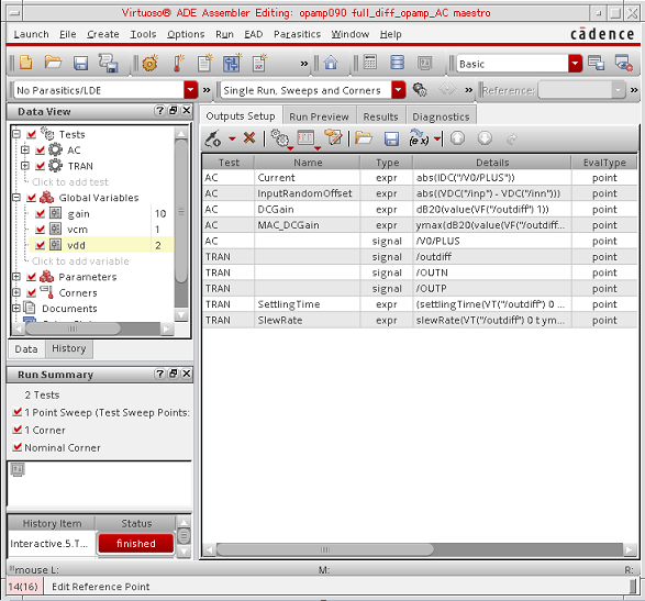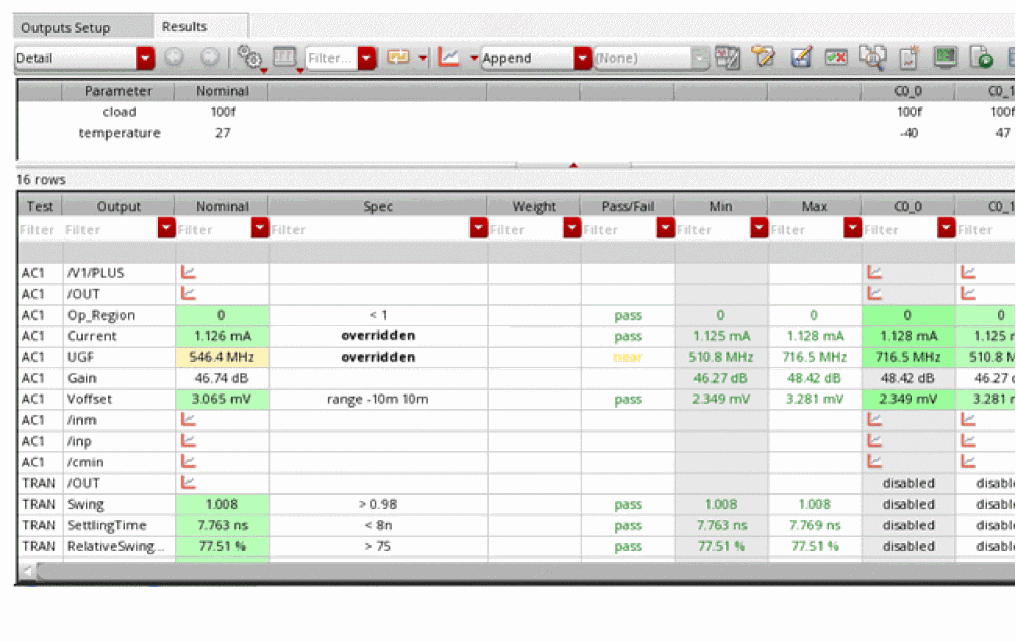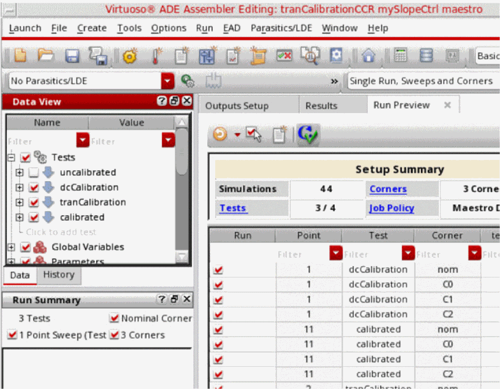 In Virtuoso ADE Assembler, you can consolidate tests for multiple blocks of a design, including the variables, device parameters, corners, checks and assertions, along with their specifications. Here, you can apply an extensive set of analyses to push the blocks and the overall design to its limits.