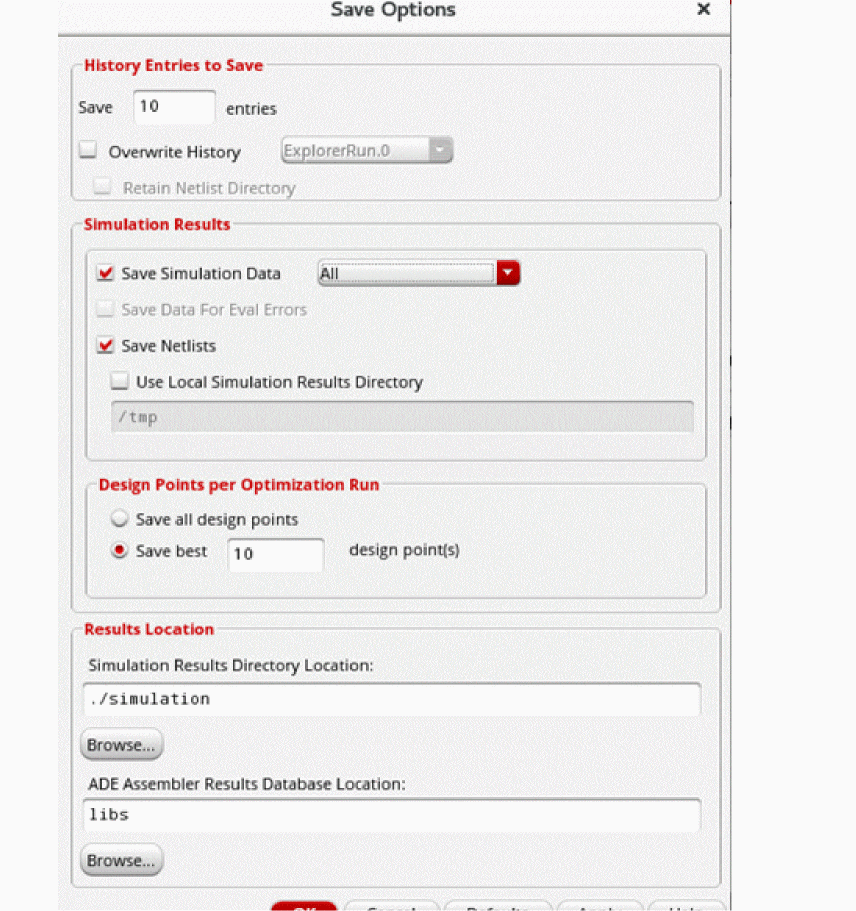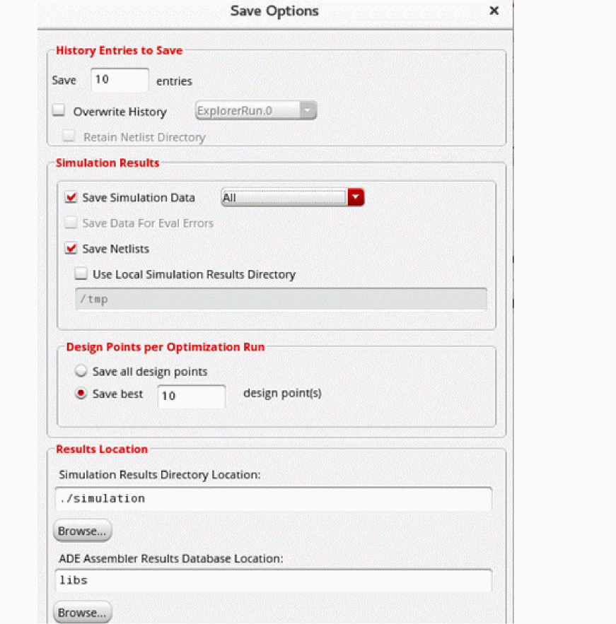 - To save only the simulation results, but not the netlist for each design point, deselect Save Netlists and select only the Save Simulation Data option. When this option is selected, the point-specific netlist data is not saved and the netlist directory for every point is replaced with a symbolic link to the reference netlist directory. This combination of save options is useful in saving space when the netlist for each design point is large and space-consuming.