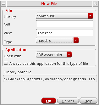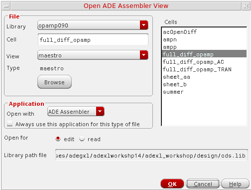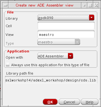 The default ADE Assembler view name and view type ismaestro. For more information about the maestro view, see Directory Structure of a Maestro Cellview. - Verify that ADE Assembler appears in the Open with drop-down list.