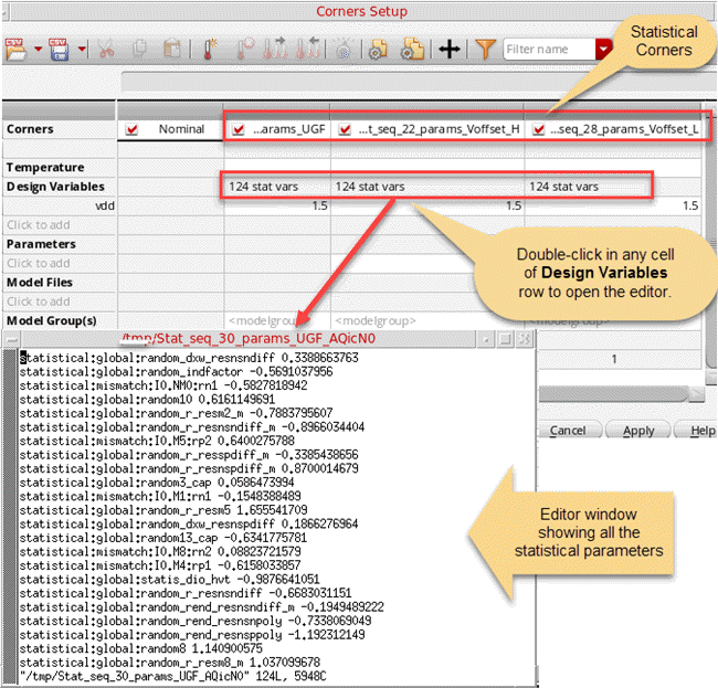 The Design Variables row displays the statistical parameters count in the N stat vars format, where N indicates the number of statistical parameters. To view the complete list of these parameters, double-click in the Design Variables cell for a statistical corner. The complete list of statistical parameters is displayed in the default text editor window for Virtuoso, as shown in the figure above.