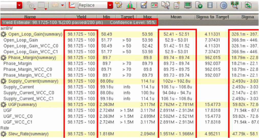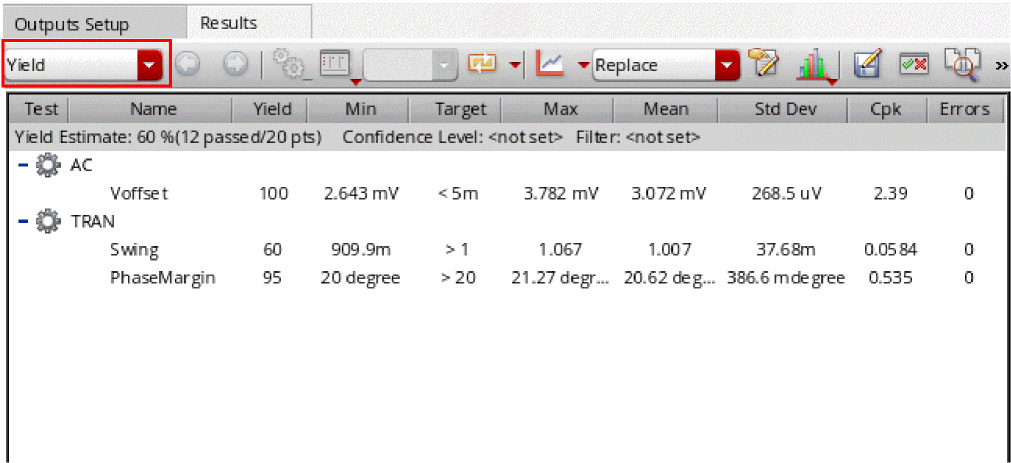 Results are reported for each test, corner and measurement expression and the total yield is reported for the circuit. For details about this view, refer to Yield view in Chapter 19, “Viewing, Printing, and Plotting Results.”.
