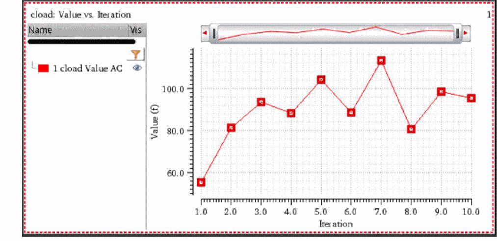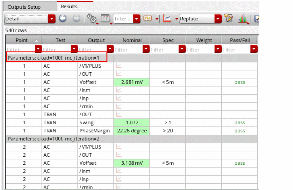 where n is the number of the sample. For example, in the following figure of the Detail view, the results under the row Parameters: cload=100f, mc_iteration=1 displays the results for the first iteration.