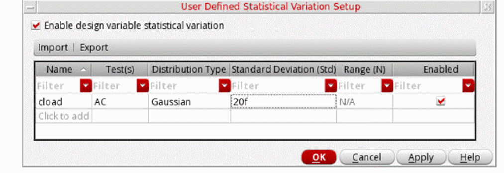- The devices or device models for which you have specified statistically varying parameter values. You must specify either global (process) or mismatch (per-instance) variations or both.
