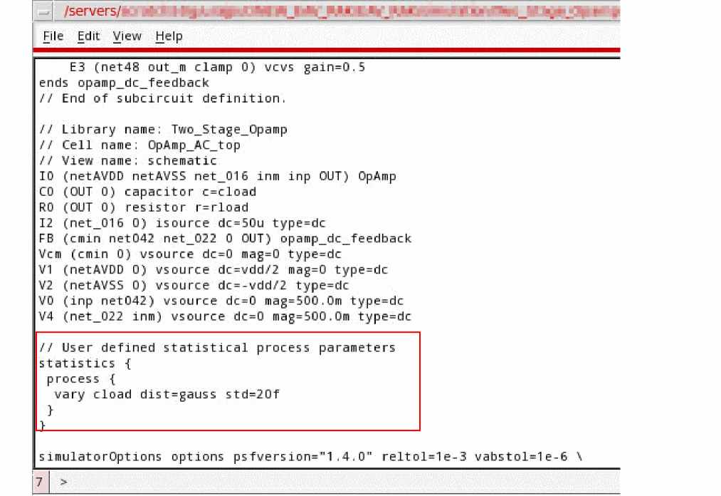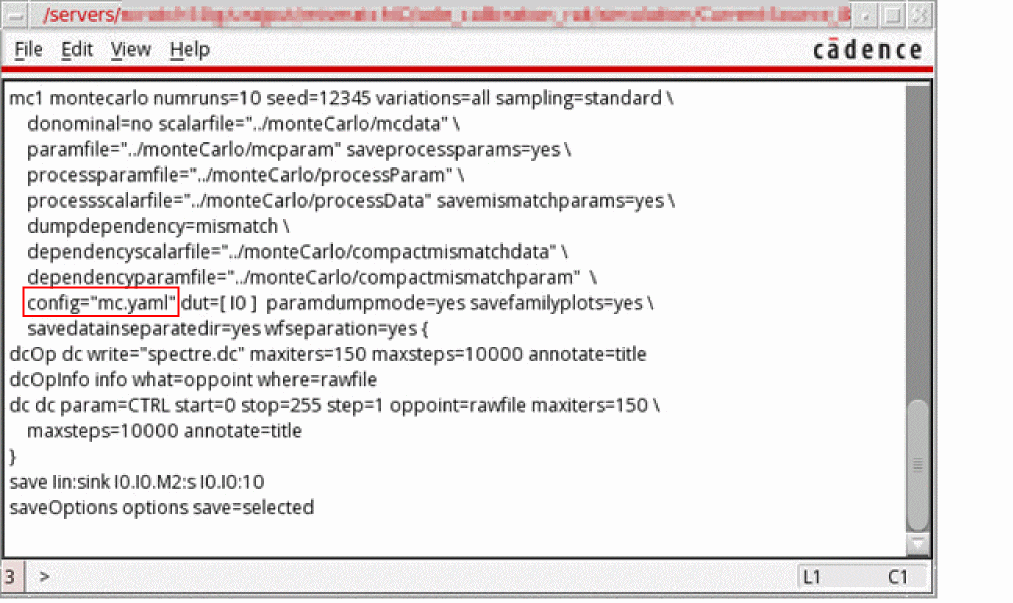 "mc.yaml" is specified as the value of the Spectre montecarlo parameter config in the netlist, as shown in the following figure.
