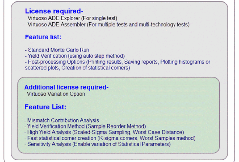 To perform statistical analysis for a single test, you can use ADE Explorer. For multiple tests or for multi-technology tests, you can use Monte Carlo in ADE Assembler.To used advanced run options or features, such as, high yield estimation, you require an additional license, Virtuoso Variation Option.