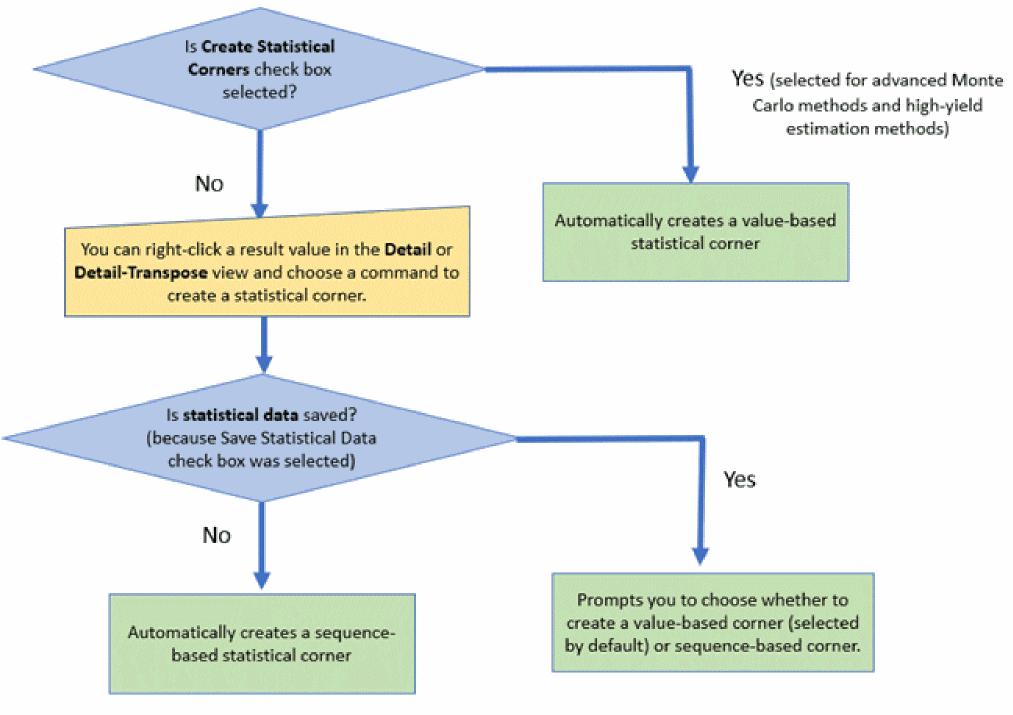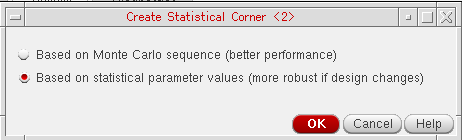 < or >, only one statistical corner is created from the percentile. A < specification type represents a corner larger than the average value. A > specification type represents a corner smaller than the average value. If the specification type is range or if a specification is not defined, two corners are created–one in each direction.By default, the corner uses the sequence ID of the sample that gives the nth worst output for a specification. Using this information, the simulator can then recreate the statistical parameter values for the corner when simulating it. This type of corner is efficient and does not require saving all the statistical parameter data for each sample in Monte Carlo. However, one disadvantage is that some changes to the design topology, such as, addition of a new instance to the schematic, can invalidate the corner. In that case, the simulator cannot recreate the same set of statistical parameter values when simulating the statistical corner. You would then need to rerun the Monte Carlo simulation to recreate statistical corners.