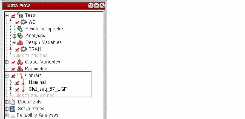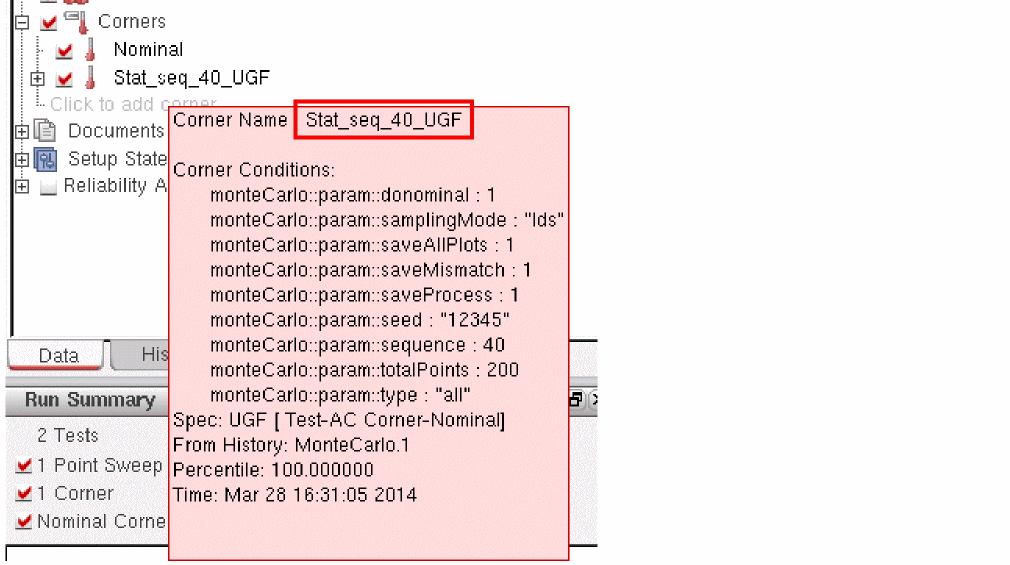 ADE Assembler looks into the simulation results to find a sample that gives the worst result for that specification and creates a statistical corner using that sample. The new corner is added it to the Corners list in the Data View assistant pane. The corner is named as Stat_Seq_<seq_ID>_<spec_name>, where <seq_ID> is the sequence ID of that sample and <spec_name> is the name of the specification. For example, if you choose to create a corner for the worst sample for UGF, ADE Assembler creates a corner with the name Stat_seq_40_UGF, where the sequence ID of the sample is 40.