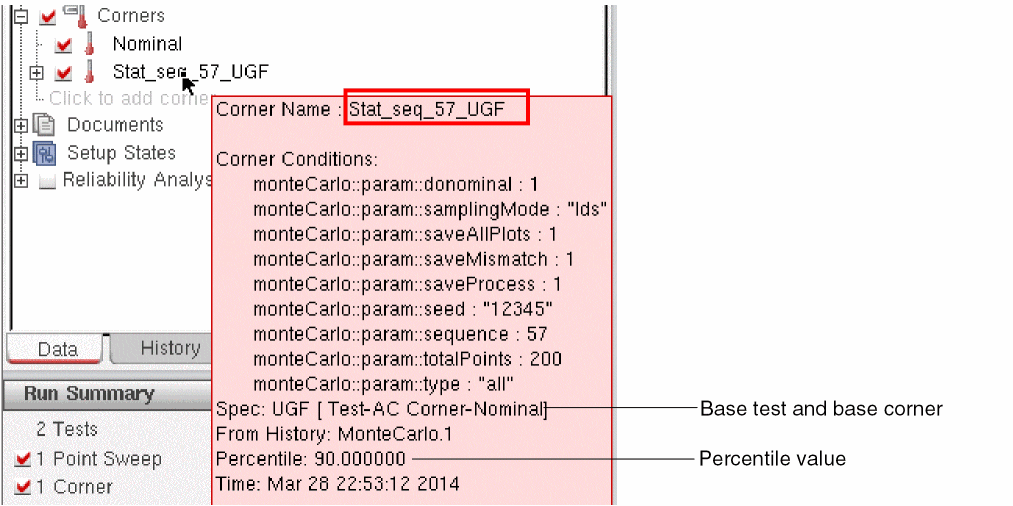 The default name of a new statistical corner consists of a prefix Stat_seq followed by the sequence ID of the sample and the specification name. The tooltip for a corner displays the values for all corner conditions, names of the base specification and base corner, and the percentile value used to create that corner, as shown in the following figure.