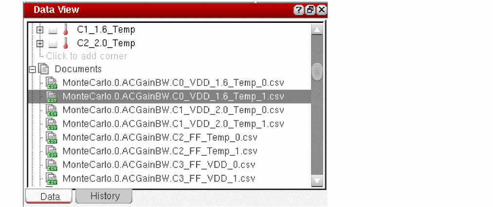 ADE Assembler exports the output data for each corner in a separate.csvfile and saves it in the specified directory. The names of these.csvfiles are also listed in the Documents list in the Data View assistant.