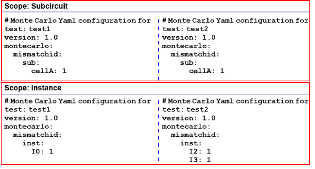 You can do so by specifying the same mismatch ID either at the subcircuit level or at the instance level for both the tests, as shown in the following YAML configurations for each test.
